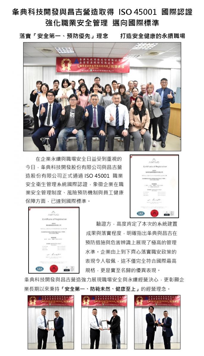 夆典科技開發與昌吉營造取得 ISO 45001 國際認證 強化職業安全管理 邁向國際標準 > 新聞中心